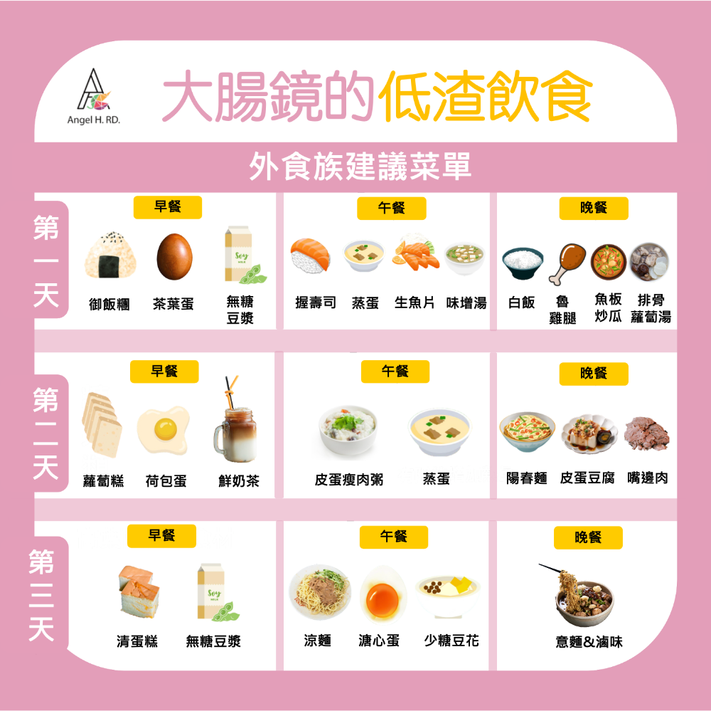 既然提到大腸鏡檢查就不得不提起檢查前的低渣飲食 ,過去在健檢後的諮詢常常聽客人提起:最困難的就是檢查前的低渣飲食,不知道該吃什麼,深怕吃錯了,腸子沒有清乾淨,會造成檢查失誤或是影響判讀。我常安慰客人不用太擔心在外無法低渣飲食,依據 102-105 年國民營養狀況變遷調查結果指出,9 成以上國人膳食纖維攝取量不足,且19歲以上族群,無論男女性其每日膳食纖維攝取量為13.5-18.8公克,與建議量20-38g相比明顯不足;因此外食基本上都會是低纖維飲食,要進一步到低渣一點都不難;但若想要低渣又要同時兼顧飲食稍微均衡一點,這個挑戰就稍微有趣一點,來看看外食的低渣飲食建議吧!
