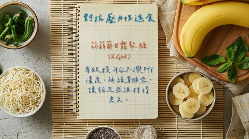 現代人生活壓力大,加班、熬夜、情緒波動再加上長時間久坐,常讓人不自覺陷入「壓力吃」的惡性循環。很多人以為自己缺乏自制力,其實是內在生理機制出了問題。 根據《Food & Function》在2024年的研究顯示,當我們攝取高黏度膳食纖維——如蒟蒻葡甘露聚醣(KGM)時,可顯著提升GLP-1與PYY的濃度。這兩種激素在我們進食時負責傳遞「我吃飽了」的訊號給大腦,一旦其濃度下降,飢餓感便會不斷湧現,使人難以抗拒零食與高熱量食物的誘惑。